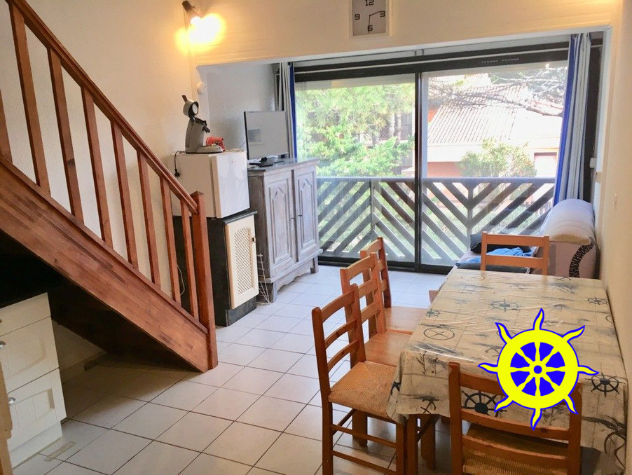 Meublé à l'année: quartier plage / lacs, studio mezzanine climatisé, avec place de parking privée, au 1er et dernier étage, entrée desservant espace rangement, lumineux séjour / cuisine aménagée equipée, mezzanine à l'étage, machine à laver, dispo le 16/12 - loyer 420 + 20 € de charges (eau)